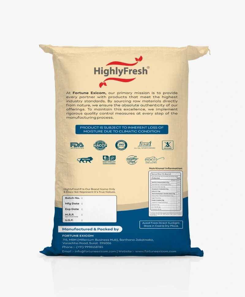 1509 Basmati Rice – White Sella is known for its long grains, quick cooking time, and consistent quality. Fortune Exicom supplies premium rice globally. We are a leading 1509 Basmati Rice – White Sella Exporter & Manufacturer in India. Our brand HighlyFresh ensures superior quality through direct sourcing and strict processing standards.