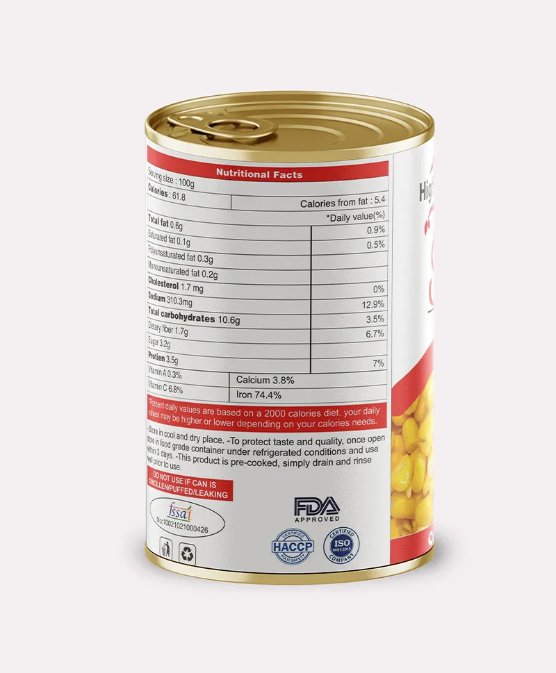 HighlyFresh Canned Sweet Corn is available in multiple packaging options — from retail-size cans to bulk catering packs for food service industries. Custom packaging and branding are available to meet specific market requirements.