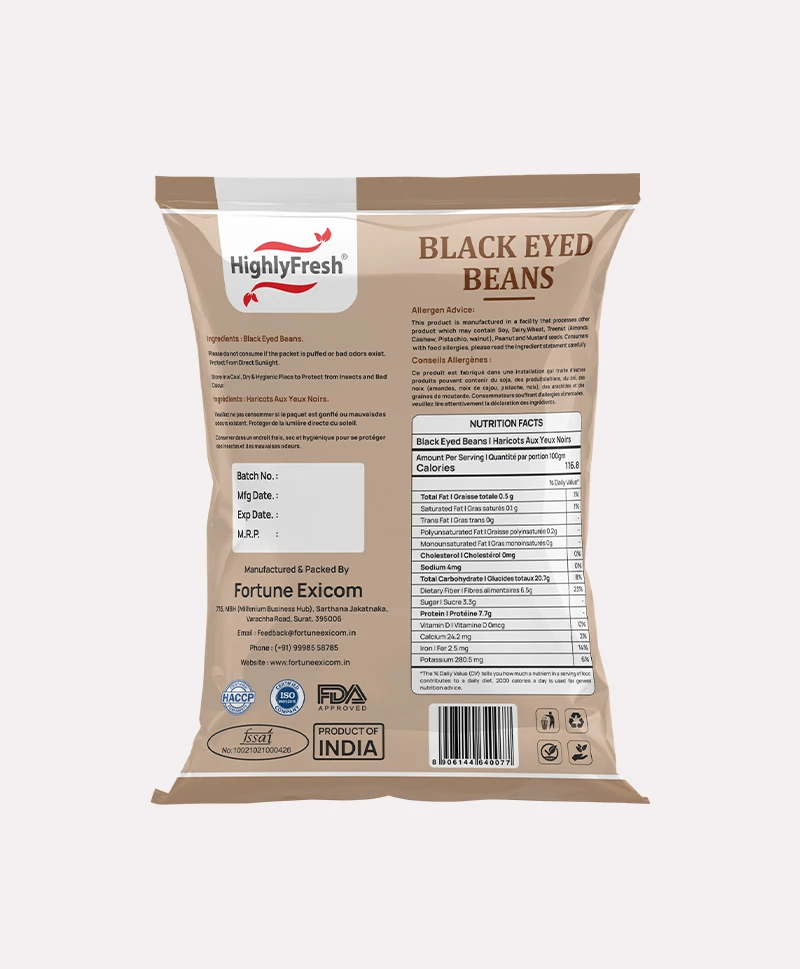 Yes. Fortune Exicom exports HighlyFresh Black Eyed Beans to major global markets including the USA, Canada, Europe, Australia, the UK, Latin America, and Mauritius. All exports follow strict FSSAI, HACCP, and ISO standards for quality assurance.
