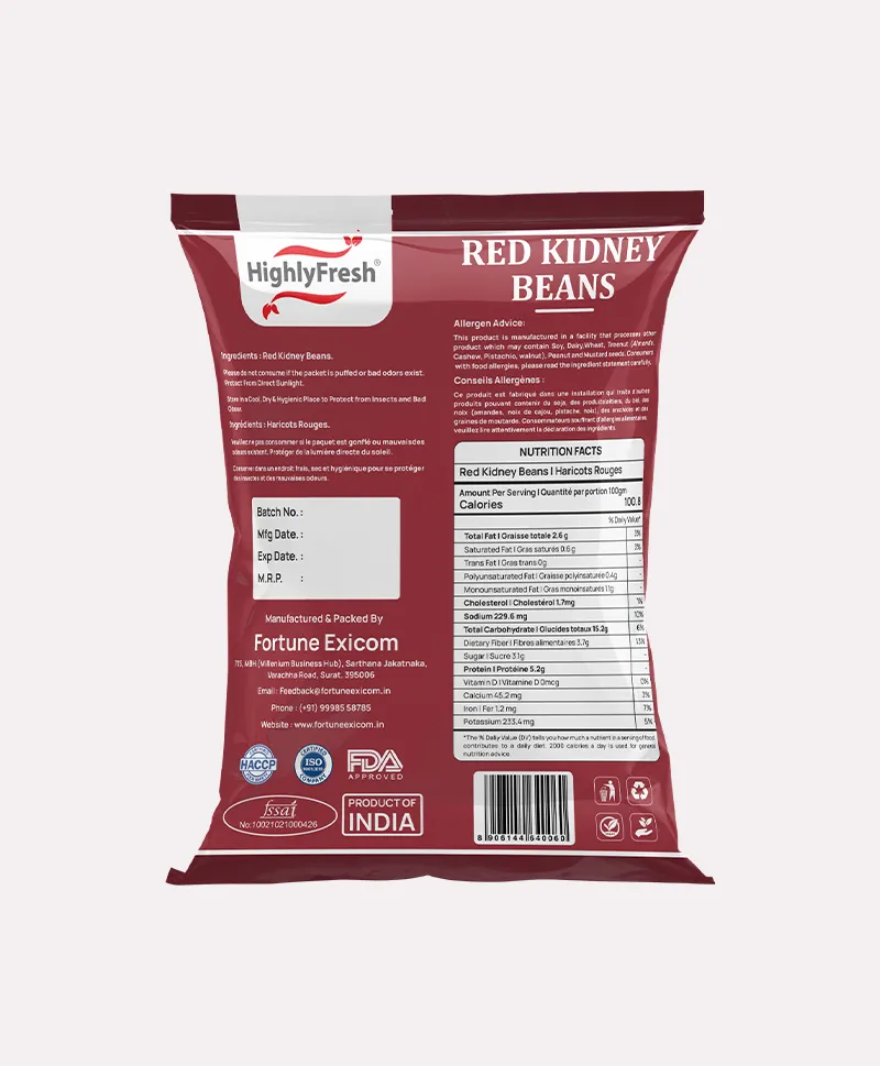 Yes. Fortune Exicom exports HighlyFresh Red Kidney Beans to leading global destinations including the USA, Canada, Europe, Australia, the UK, Latin America, and Mauritius. All exports meet international quality standards such as FSSAI, HACCP, and ISO.