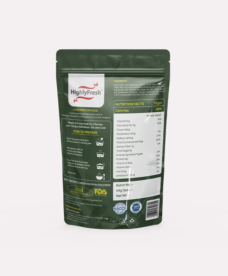 HighlyFresh Pulav, produced by Fortune Exicom, is crafted using premium basmati rice, vegetables, and aromatic Indian spices. It delivers authentic restaurant-style flavor with zero preparation time, making it ideal for travelers, busy professionals, students, and international ready-meal buyers.