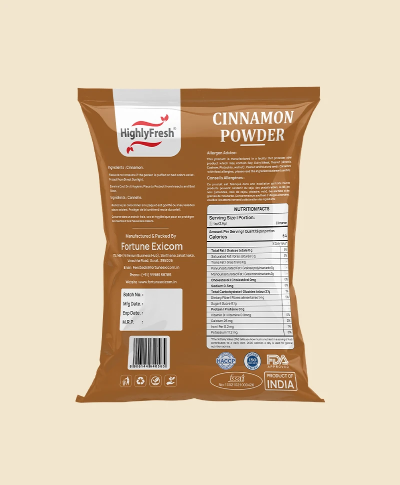Yes. Fortune Exicom exports HighlyFresh Cinnamon Powder to major international markets including the USA, Canada, Europe, Australia, the UK, Latin America, and Mauritius. The product is packed under FSSAI, ISO, and HACCP certified facilities to meet global food standards.
